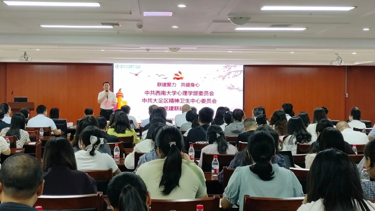 为深入贯彻落实新时代党的建设总要求,创新基层党组织协同联动新模式,9 月 20 日,西南大学心理学部党委与重庆市大足区精神卫生中心党委联合举办“联建聚力 · 共健身心”党建联建活动。全国党建工作样板支部、全国高校“双带头人”教师党支部书记“强国行”专项行动团队——心理学部教师第一党支部委员及党员代表,学部党员教师代表、大足区精神卫生中心中小学心理健康教育教师、基层医疗卫生机构精防医生等百余人参会。 心理学部党委副书记陈诚,重庆市精神卫生中心党委副书记蒋国庆,大足区卫生健康委党委书记、主任谢洪等出席活动。